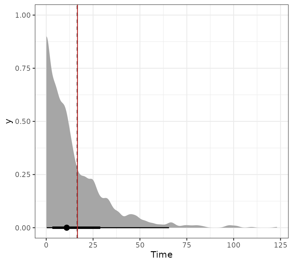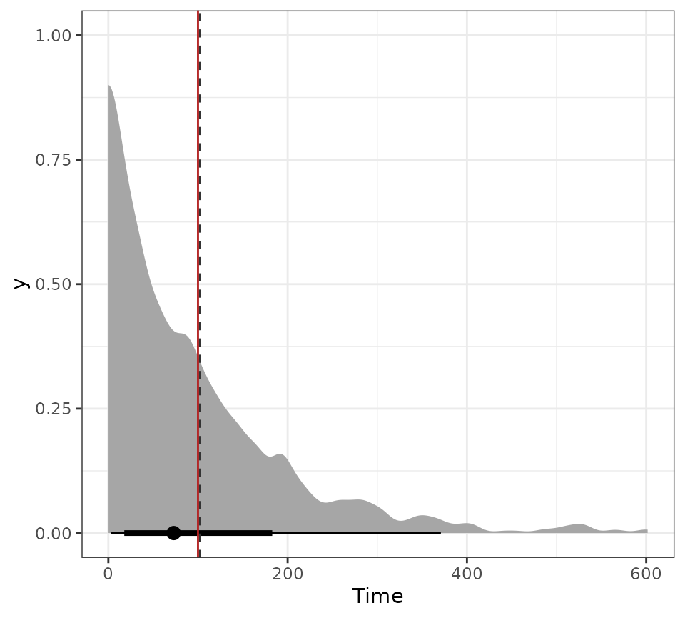 plot_time_dist(times) + geom_vline(xintercept = 1 / sum(w0), color = "firebrick")