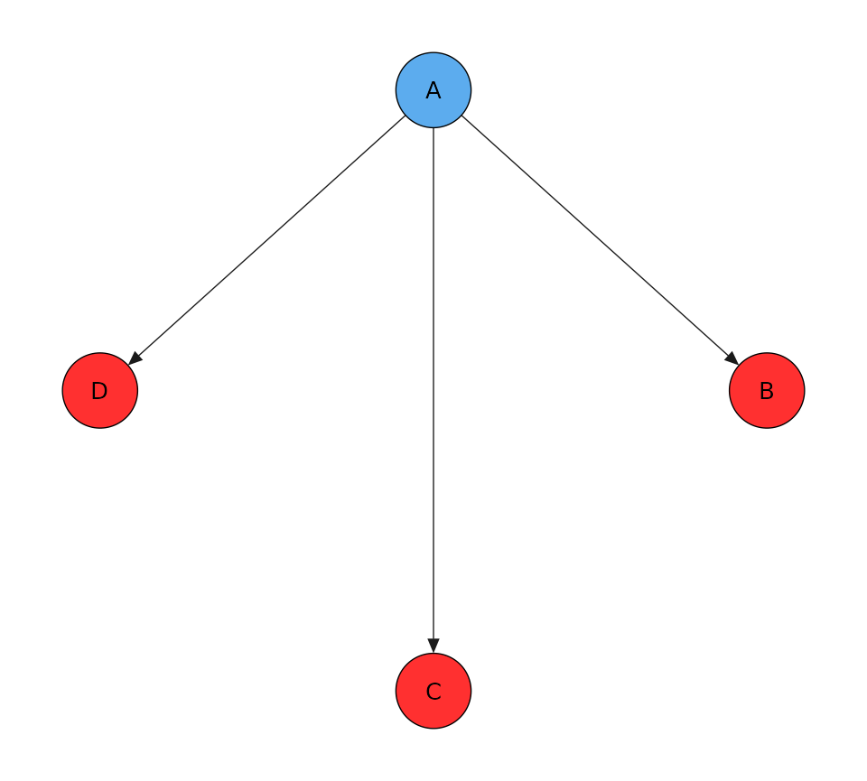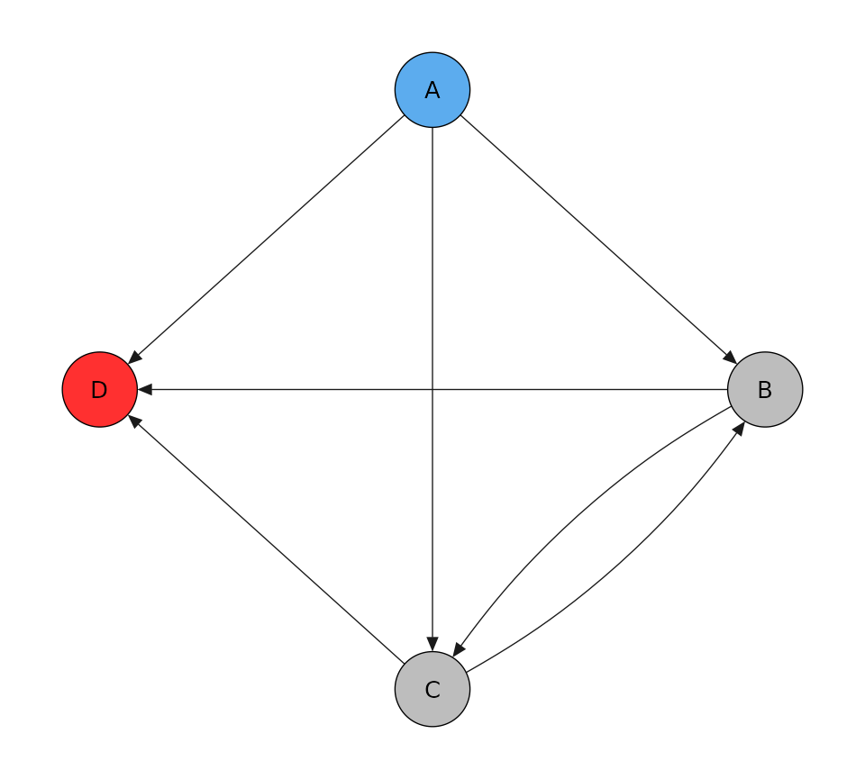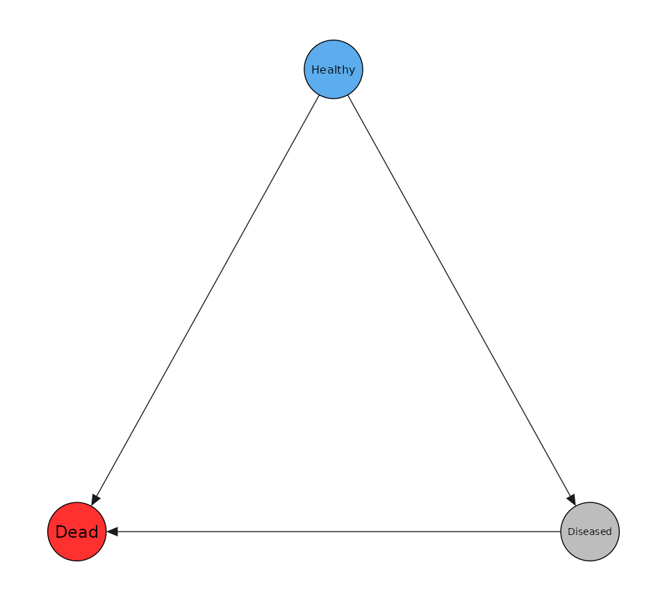 In a multistate model, we can represent the possible transitions between states as directed edges of a graph whose nodes correspond to states . The transitions that start from the same node are all at risk simultaneously when the system is in this state. The transitions that are at risk simultaneously are competing, meaning that occurrence of one transition censors the other ones.